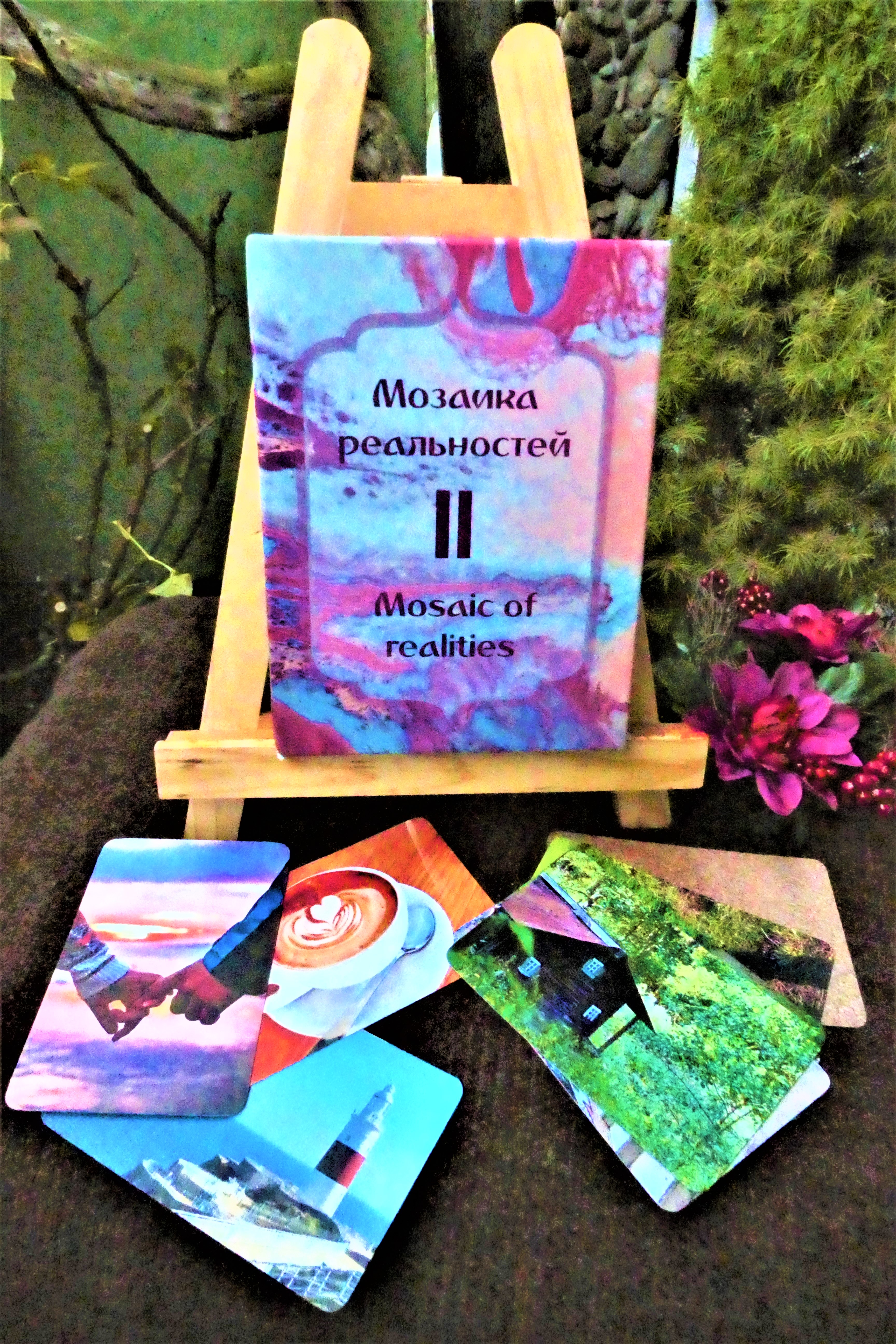 Комплект карт «МОЗАИКА РЕАЛЬНОСТЕЙ II» состоит из 170 карточек с фотографиями, и предоставляет возможность работы над собой как самостоятельно, так и с помощью психолога, индивидуально или в группе. Их можно использовать как отдельный инструмент, или комбинировать с другими картами и картинками. К ним также применимы основные методы работы с метафорическими ассоциативными картами в классической практической психологии.